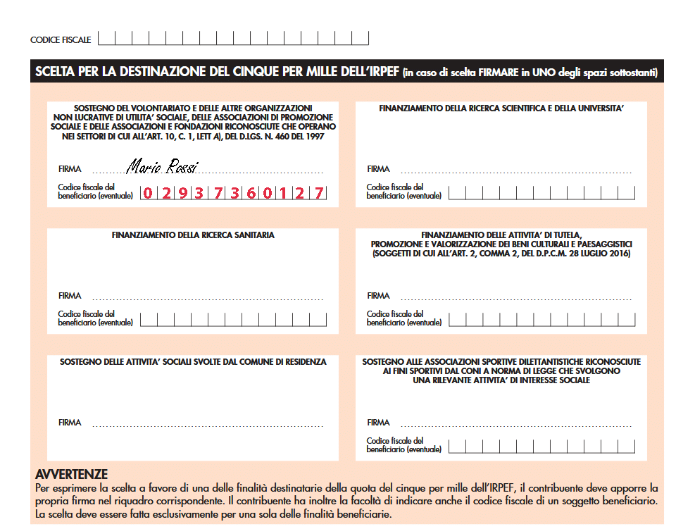 Non si tratta di una tassa aggiuntiva, ma di un modo per scegliere a chi destinare parte delle proprie tasse, che andrebbero comunque allo Stato. Bastano solo la tua firma e il nostro codice fiscale.